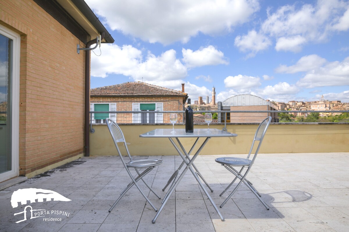 Квартира знаходиться в стратегічному місці: біля воріт міста Сієна, легко дістатися з кільцевої дороги та безкоштовної критої парковки. Міський автовокзал знаходиться всього в 50 метрах від комплексу. Двокімнатна квартира площею 48 квадратних метрів, що складається з двоспальної спальні, ванної кімнати, вітальні з міні-кухнею, сковорідками та каструлями, а також дивана-ліжка. Квартира вміщує від 1 до 5 осіб.