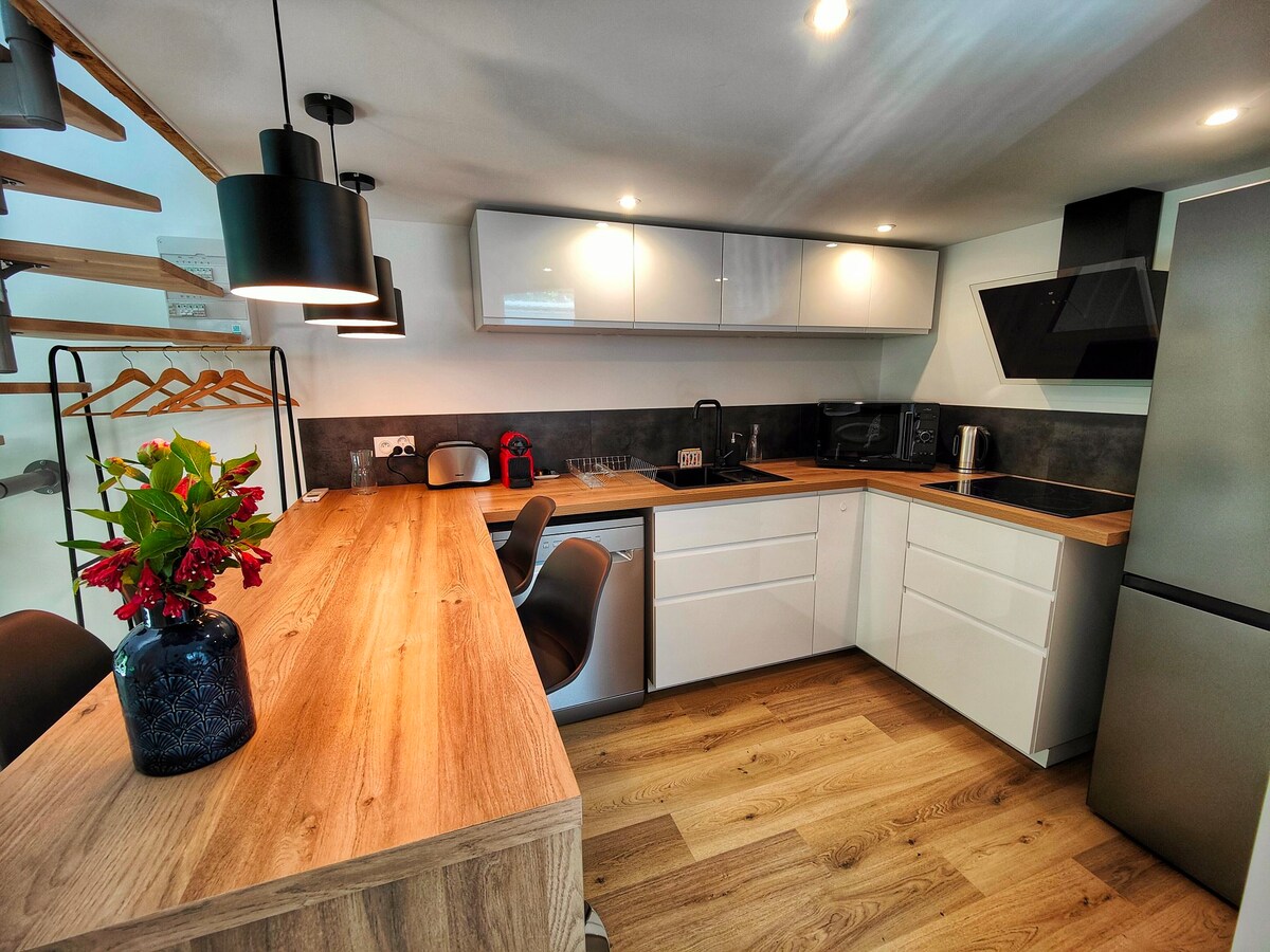 З видом на ліс Вона включає спальню з двоспальним ліжком, зручний диван-ліжко, повністю обладнану кухню (плита, духовка, холодильник) та ванну кімнату з душем, раковиною та туалетом. Приватний сад чекає на вас для відпочинку: барбекю, обідня зона, шезлонги, ігри, книги та телевізор із Netflix. Всього за 15 хвилин ходьби від залізничного вокзалу та за 2,2 км від Роше-Канон. Сніданок надається за запитом. Проживання для некурців. Безкоштовна стоянка.