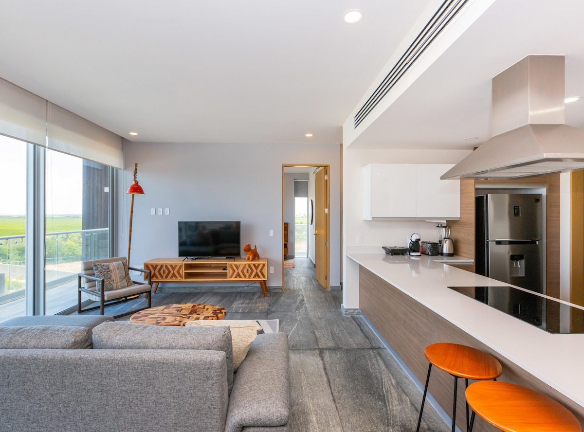 This condo lives inside a friendly beach front community nesting in the lively neighborhood of Puerto Juarez, across "Playa del Niño", a beloved beach spot for locals away from the bustle of the hotel zone. This community is also surrounded by mangroves and the Cancun’s coastline where its residents and guests enjoy of a privileged location where their days start with a peaceful sunset on the beach and from there, each hour & days are a happy adventure and also that place..home