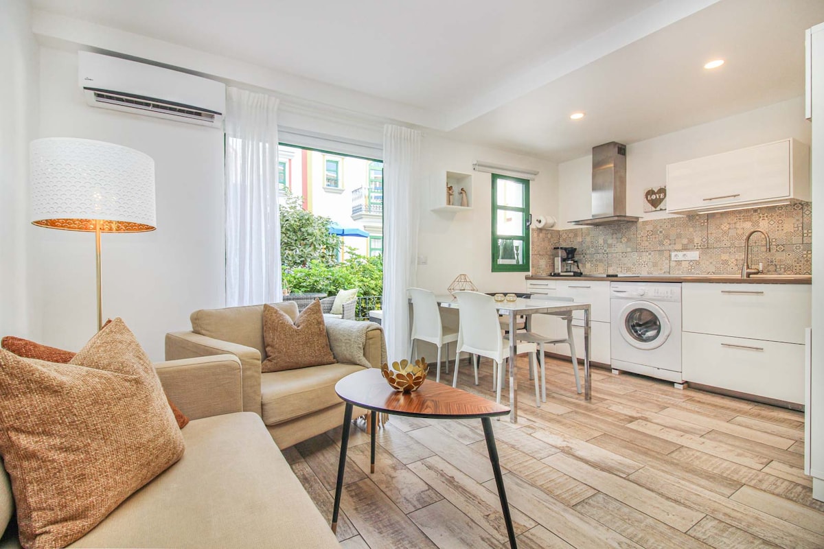 Квартира для 2 осіб займає привілейований куточок на 2-му поверсі La Colonial Suites, реабілітованого будинку в старому місті Вегета. Площа площею 56 кв. м об 'єднує балкон з боковим видом на собор Санта-Ана, окрему спальню, їдальню з відкритою кухнею та велику ванну кімнату з ванною без реєстрації. Світлі, високі стелі з оригінальними балками, кам 'яними стінами та гідравлічною плитковою підлогою створюють чарівну атмосферу. Розкішне враження в унікальному місці