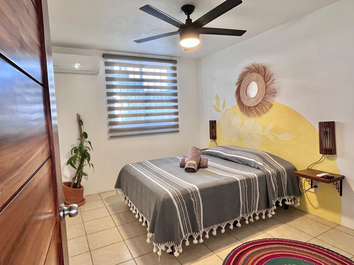 Відчуйте спокій у нашому просторому люксі king-size на першому поверсі. Насолоджуйтеся затишним ліжком king-size з високоякісними простирадлами, окремою ванною кімнатою, міні-холодильником та кондиціонером. Вийдіть на патіо з гамаком, оточеним рослинами та краєвидом на басейн. Всього в 5 хвилинах ходьби від Плайя-Сікатела і прямо біля нового ринку. *Затишне ліжко king-size, простирадла преміум-класу *Окрема ванна кімната *Освіжаючий басейн, вуличні меблі. *Міні-холодильник *Кондиціонер *Wi-Fi *телевізор *Просторий шафа * Патіо для відпочинку з гамаком. *Прийміть місцеву елегантність дерева.