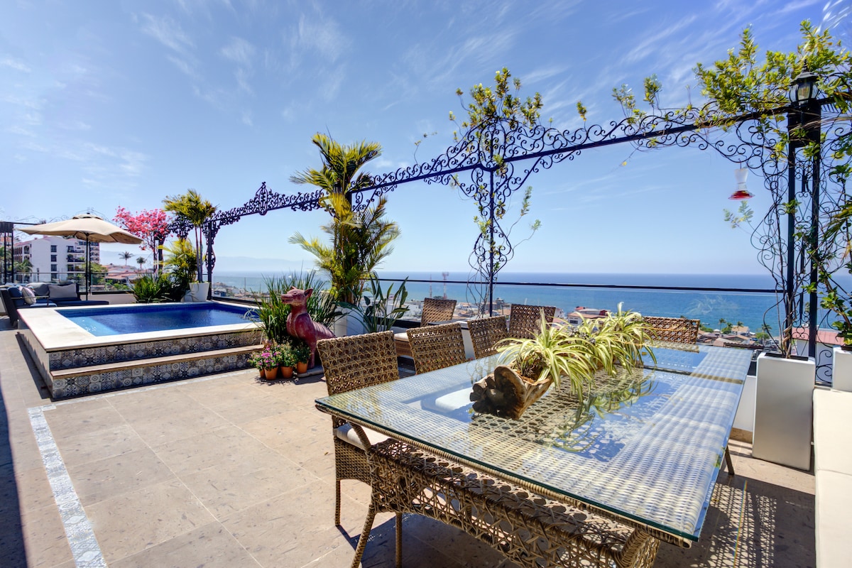 Унікально оформлений будинок із сучасним факелом, що супроводжується великим панорамним басейном на даху з підігрівом і видом на океан, місто, готелі та гори. Будинок розташований на невеликому пагорбі з бездоганними краєвидами неподалік від усіх подій, але все ще достатньо далеко, щоб насолодитися спокоєм і унікальністю району Пуерто-Вальярта.