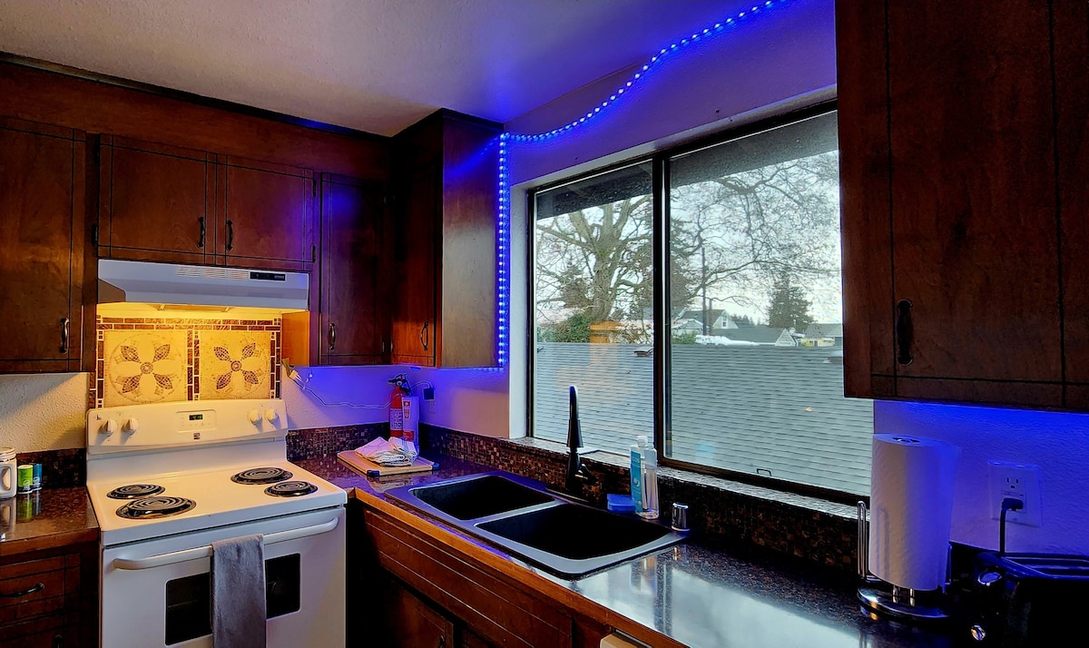 Бунгало з 2 ліжками та 1 ванною, розташоване на півдорозі між входом до Олімпійського національного парку та центром Порт-Анджелеса. За півмилі від туристичного центру ONP, 1/2 милі до олімпійської стежки, 1/2 милі до набережної та в 1 милі від причалу, до нашого місця легко дістатися пішки, на велосипеді або автомобілі. Також неподалік - Hurricane Ridge, лавандові поля Sequim та Victoria B.C. Ми ідеально підходимо для бігунів, гірських велосипедистів, човнистів, митців та сусіднього Канукса. (Зверніть увагу, що ми на жвавій вулиці)