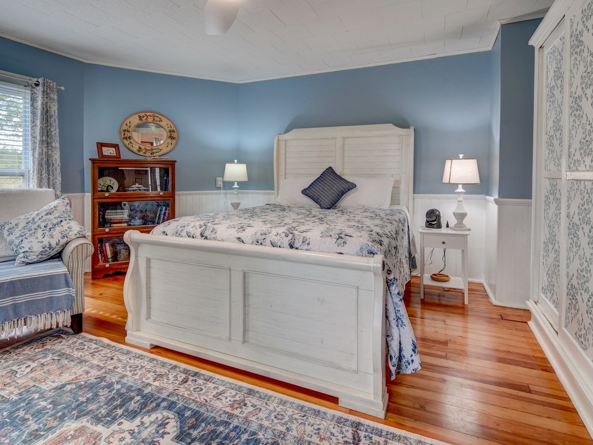Enjoy a comfortable and convenient stay on the entire private 2nd floor of the home. You’ll have access to 3 large bedrooms that can sleep 6. There are 2 queen rooms and 1 twin, a shared kitchenette and large bathroom. The floor includes: *Roku TVs with streaming options *A/C for warm days *Electric fireplaces in each room for cozy nights *Large windows throughout the space for natural light *Ceiling fans *Comfy queen or twin bedrooms with soft, hotel-quality linens and quilts *Guest favorite