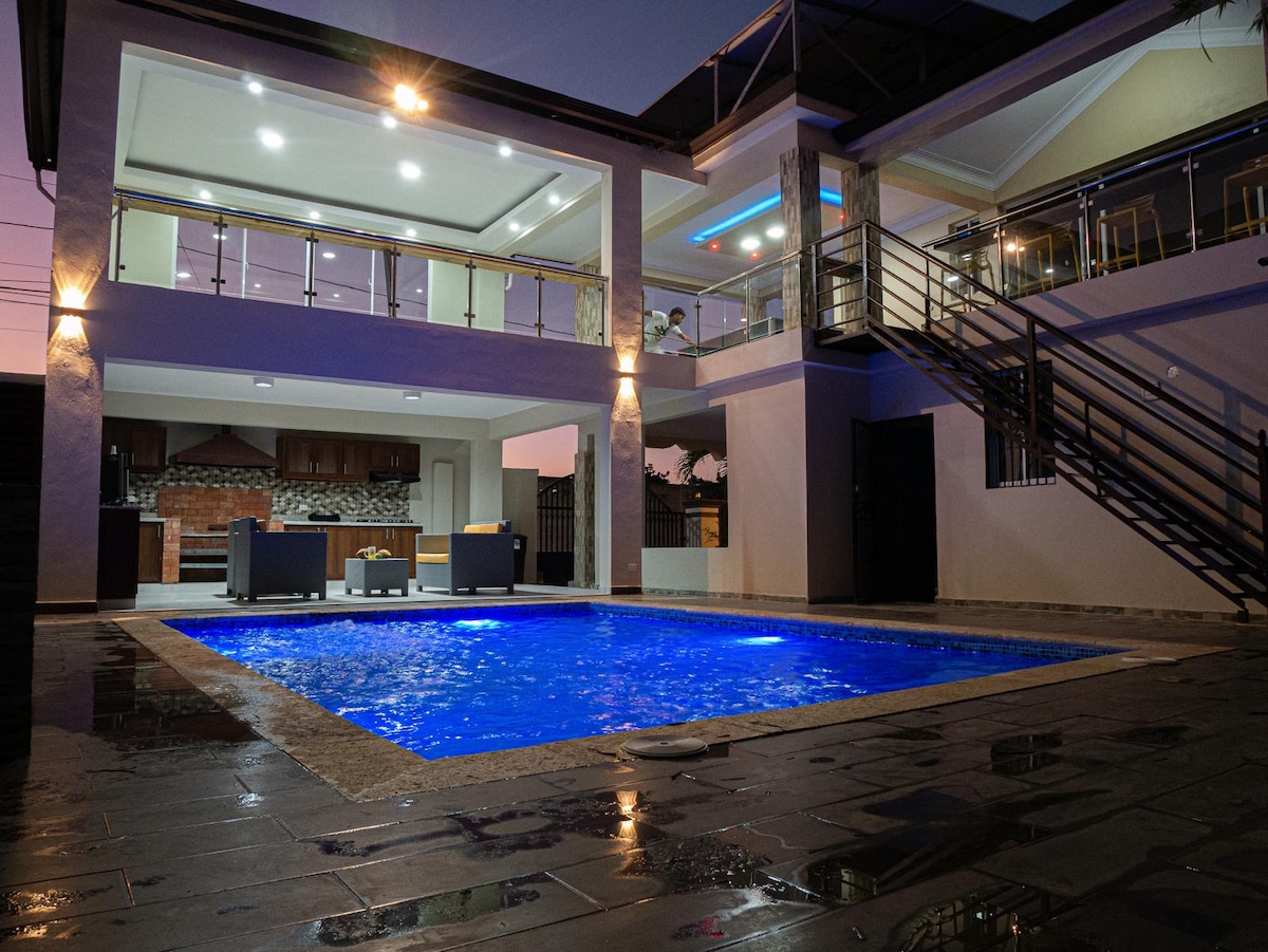 Сімейний заміський будинок з усіма зручностями, включаючи глибокий басейн, неглибокий басейн, водоспад, джакузі з підігрівом, баскетбольний майданчик тощо. Великий безпечний двір із різними фруктовими деревами та зонами для сімей, включаючи альтанку з газовим барбекю або відкриту терасу з вугільним барбекю. Будинок має відкритий план поверху, головна спальня на першому поверсі, велика офіційна їдальня на 12 осіб і невелика повсякденна обідня зона на 8 осіб.