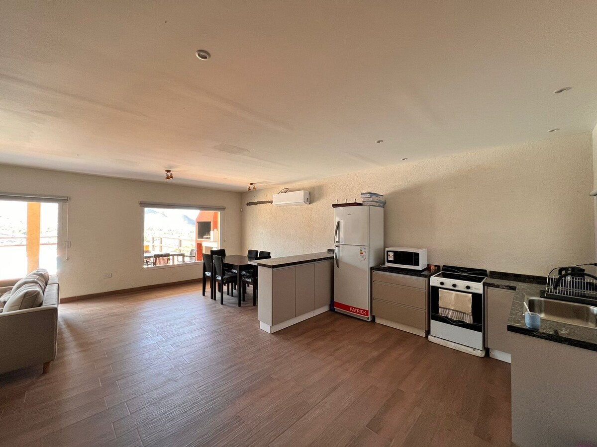 Relajate en nuestra suite para parejas con vista a las sierras, ubicada en una zona tranquila, con pileta, ducha escocesa, asadores, en medio de la naturaleza. La suite cuenta con una cama doble, TV plana por satélite, wifi, todos los artefactos de cocina y baño eléctricos. También cuenta con un hermoso jardín para relajarte con una vista inigualable.