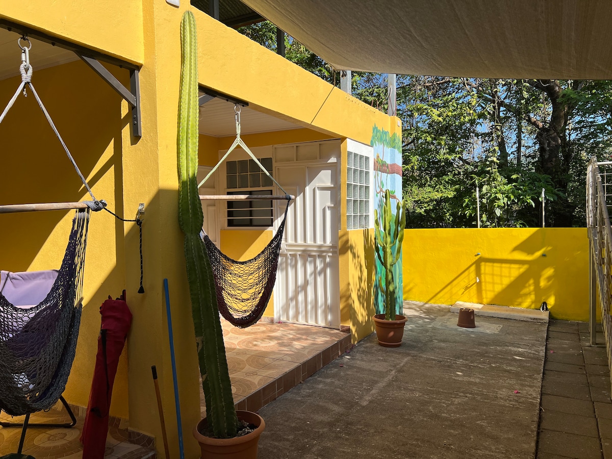 This space is very quiet, enhanced to enjoy nature right from your own terrace. It offers a studio feel with the size of a Casita, offering a Queen bed, a complete bathroom with hot water tank, kitchenette with all the needed cooking utensils, sitting area indoor and outdoor with comfy space, ideal for couples. The forest is your backdrop from this cozy space, it allows you the opportunity to spot tropical bird residents, wildlife, and tropical flowers right from your private terrace.