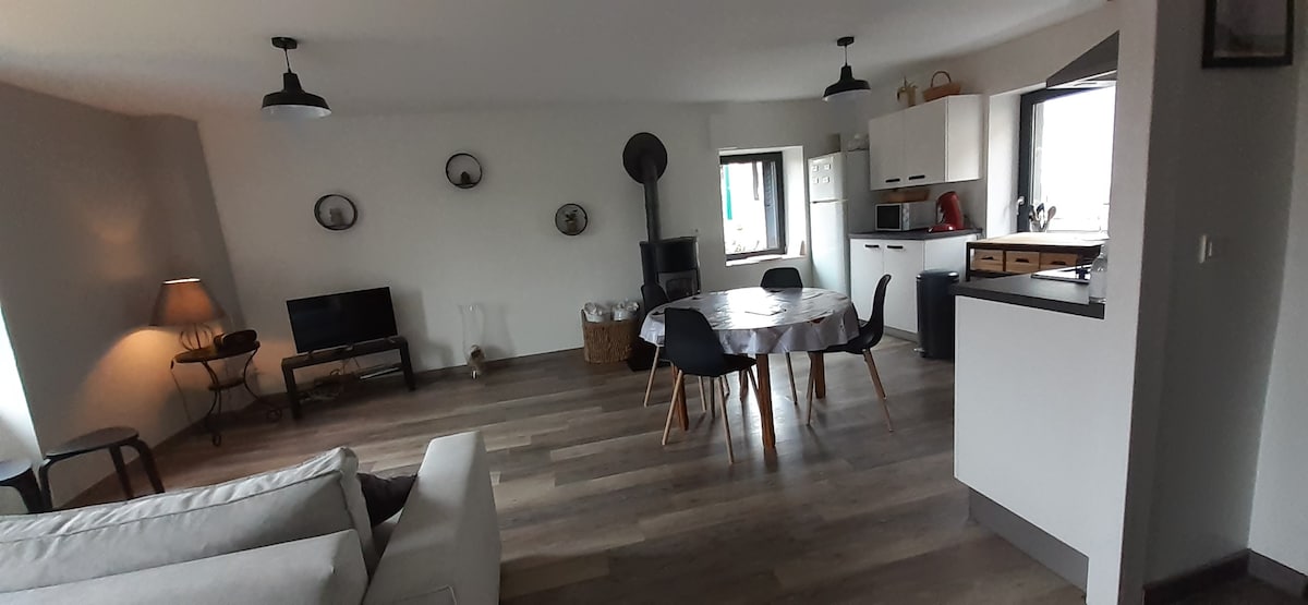 Квартира на першому поверсі будинку власників, окремий вхід, розташований в трьох кілометрах від села, відкритий вид на вершини Канталь, дуже тихе місце. Кухня обладнана (холодильник, індукційна варильна панель, кавоварка, кавоварка, посудомийна машина, духовка та мікрохвильова піч). Басейн доступний у сонячні дні (басейн не опалюється). Можна з домашніми тваринами, але територія не огороджена, і за необхідності я надаю ковдру для дивана.