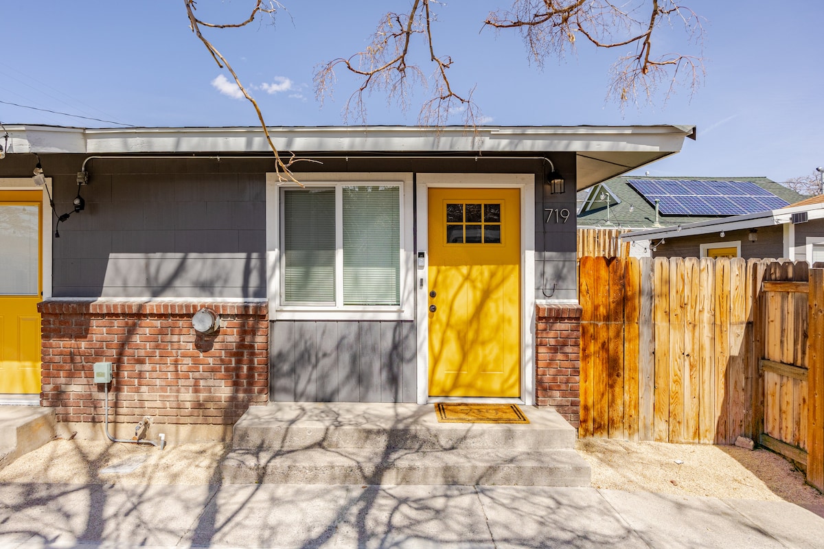 A charming 1940 brick duplex, updated for modern living in Reno's Wells Avenue district with yard, mountain views, cute garden, and off-street parking. The quaint 1bd features a queen bed, WiFi, work space, and an 80in projector with HD display and Bose speaker for a movie-like experience. We updated the entire interior - new plumbing, electrical, kitchen and bath. The result is a crisp white modern one-bedroom that provides everything you need for a relaxing holiday in the heart of Reno.