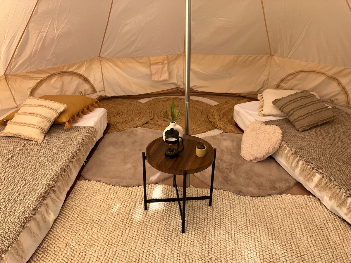 Tente cloche style yourte. Venez découvrir l'expérience Glamping tout confort en bénéficiant des services du camping à 50m de la plage. Couchage 2 personnes (2 matelas 80x200). Veuillez porter vos draps et sacs de couchage. (Option literie possible : 15 euro). Moustiquaire, verrous sur fermeture éclair, petit ameublement, espace salon intérieur et extérieur ombragé. Frigo commun, petite vaisselle et ustensiles disponibles. 3 logements similaires dans même zone si besoin