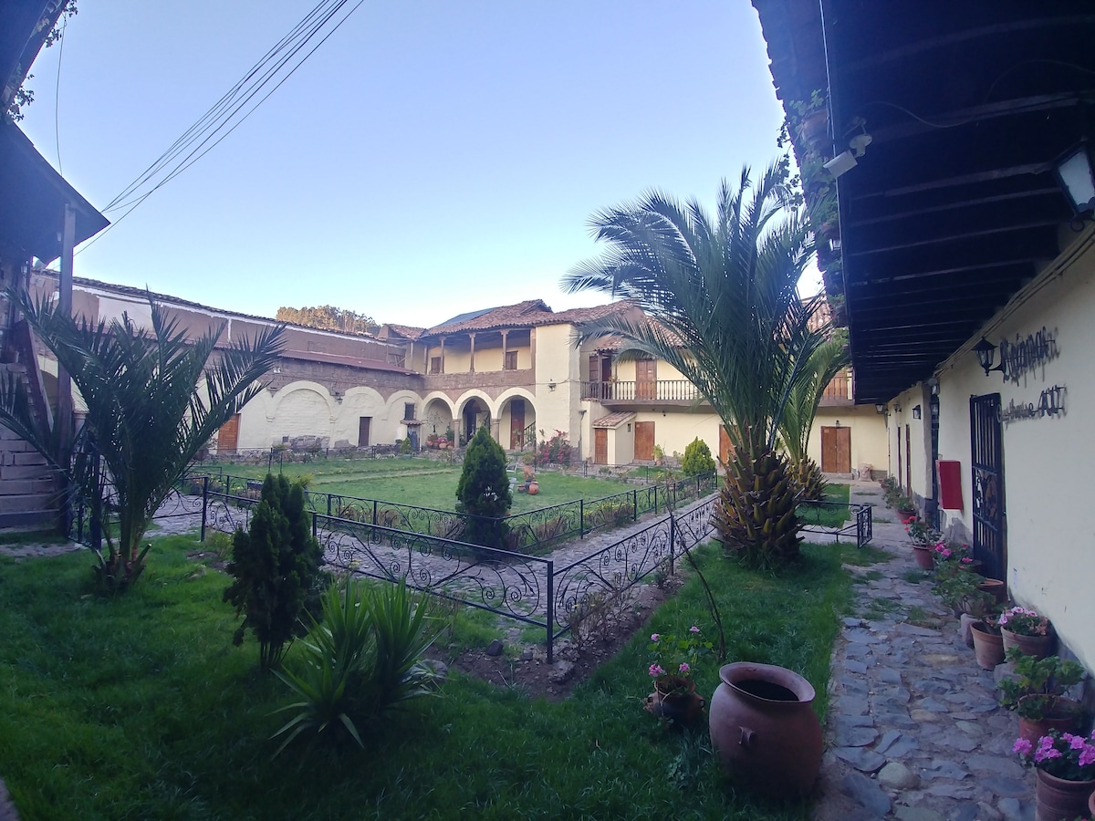Наше помешкання - це романтичний люкс із художнім характером. Усі меблі та прикраси були розроблені та виготовлені відомими ремісниками Асоціації Дон Боско. У вас буде приватний простір для вас і вашого партнера з видом на камін і сад. Наше ліжко - це ПОВНОЦІННЕ ЛІЖКО - Чистота: наш персонал із прибирання професійно навчений, щоб наші помешкання були бездоганними та охайними для кожного гостя. - Розташування: ми розташовані в центрі історичного центру Куско.