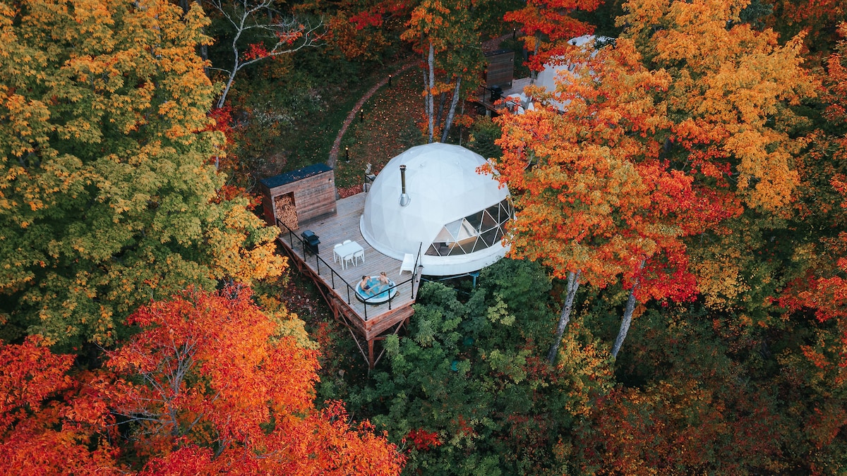 Ласкаво просимо до Nørdika Charlevoix. Ми пропонуємо ексклюзивні куполи, обладнані всім необхідним, щоб ваше перебування було легким, справжнім і незабутнім. Кожен купол має власну терасу та гідромасажну ванну. З цих куполів, розташованих серед верхів дерев, відкривається ідеальний вид на річку Сен-Лоранс і навколишні гори. У кожному помешканні ми пропонуємо повну ванну кімнату, міні-кухню , дров 'яний камін, ліжко king-size, антресоль з двоспальним ліжком та комфортну вітальню.