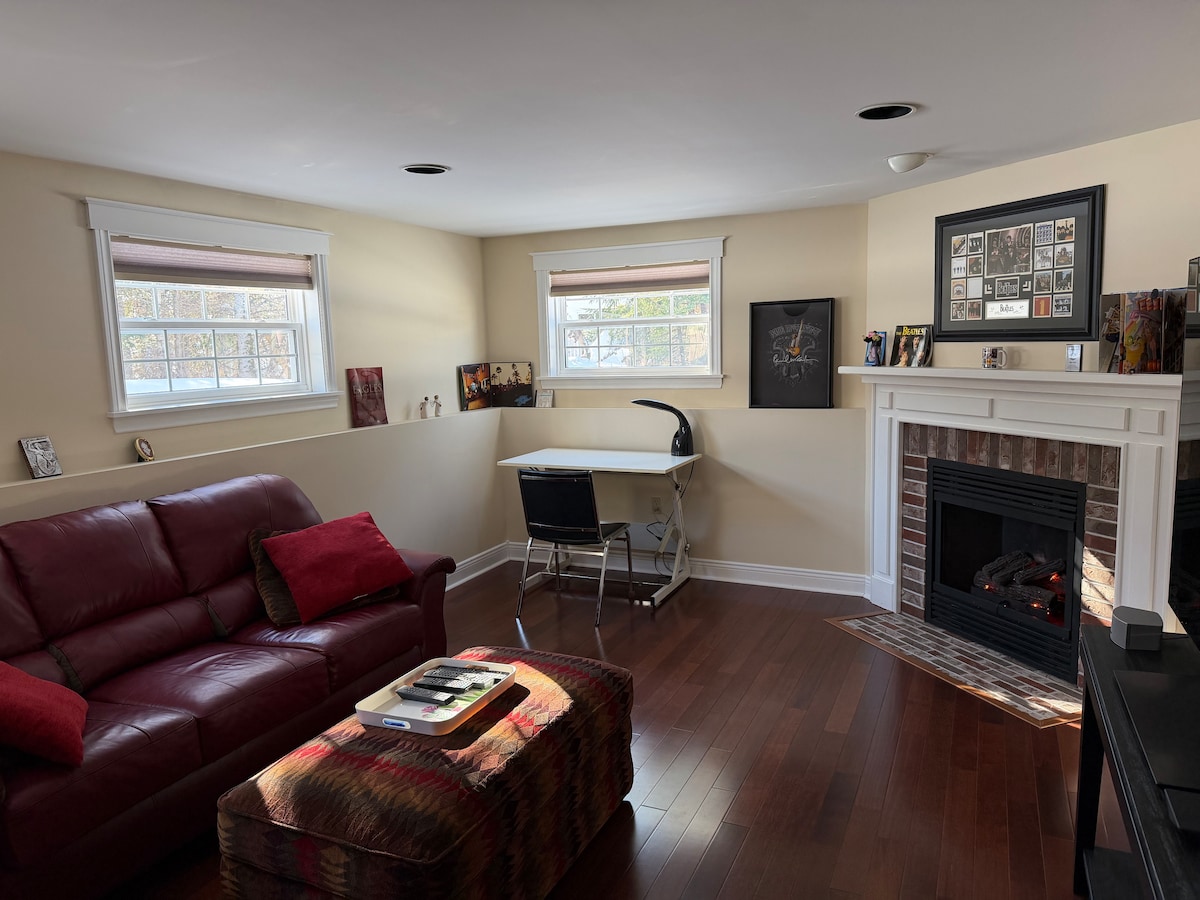 Ця унікальна оселя має власний стиль. У вітальні є велика секція, де можна відпочити та переглянути телевізор. Великий телевізор оснащений Apple TV, в якому є багато застосунків, які можна використовувати. У номері є розкішна ванна кімната з ванною, душем і каміном. Ви можете тренуватися на велосипеді Echelon і користуватися їхнім застосунком для фітнесу на своєму телефоні. У вашому розпорядженні безкоштовна кава Nespresso. 9 хвилин їзди до університету Нью-Брансвік. Задній двір прямує до лісу, де приємно гуляти, ходити у сніговому взутті, кататися на лижах.