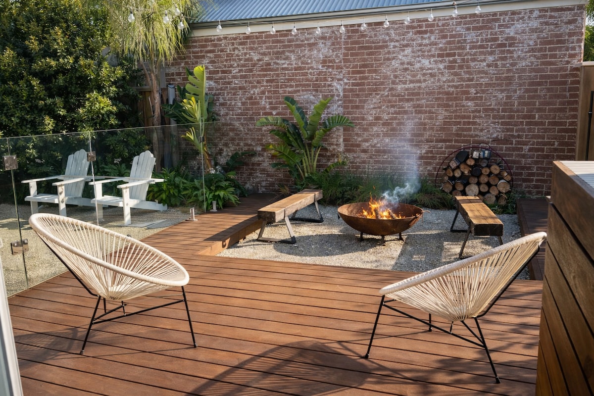 Ми пропонуємо вам можливість зупинитися в нашій повністю обладнаній, приватній, спеціально побудованій квартирі в задній частині нашого помешкання. Підходить для 4 дорослих, 1 дитина, 1 немовля. У прибережному селі Квінскліфф, всього за 1,5 години від Мельбурна, з легким доступом до Великої океанської дороги. Ваша гідромасажна ванна, розташована в усамітненні заднього саду та заходу сонця від сусідньої пішохідної доріжки. Легка прогулянка до гавані, місцевих магазинів/ресторанів, блюзового поїзда та пляжу. Зручні ліжка, якісна постільна білизна та континентальний сніданок - усе включено.