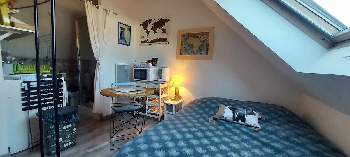 Між сушею та морем. Яскрава, комфортна, добре обладнана, незалежна студія; ідеально підходить для однієї людини (відпустка, ділова поїздка) або двох. Зверніть увагу на круті сходи. Розташоване в муніципалітеті в центрі природи (Blavet 600 м), магазини, ресторан, автобус, кінотеатр, театр. Ідеальна відправна точка для піших прогулянок, їзди на велосипеді вздовж буксирної доріжки, відвідування Лор 'ян, його околиць, прекрасних пляжів у 20 хвилинах ходьби (Гавр). + тихий сад зі столом, стільцями, шезлонгами, парасолькою!