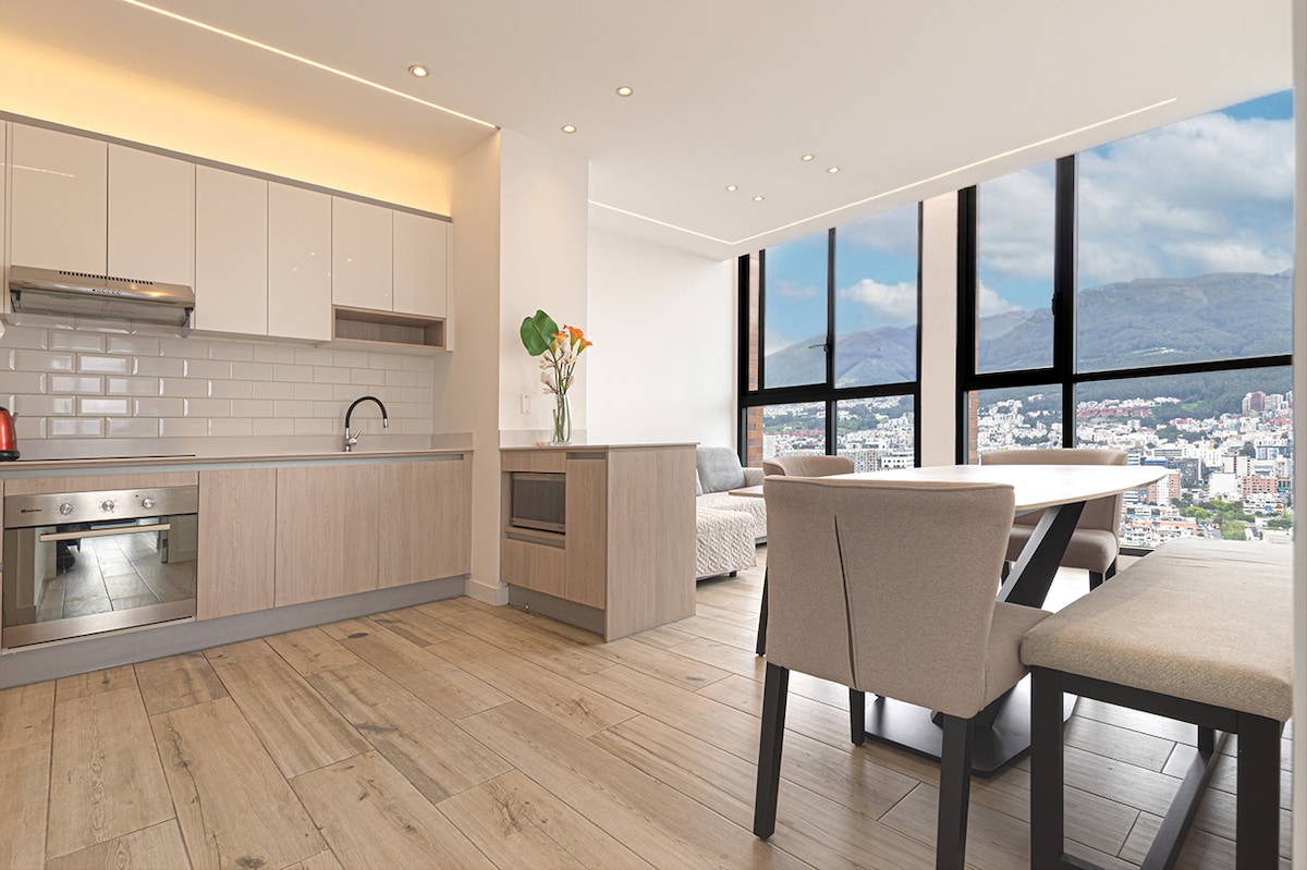 Зупиніться в стильному люксі й насолоджуйтеся найкращим видом на Кіто в одній із найвищих будівель столиці Поруч із олімпійським стадіоном Атауальпа, торговими центрами Ліжко 3 квадрати, диван-ліжко, телевізор, Wi-Fi, Netflix, обладнана кухня 1 1/2 ванної кімнати Пральна машина, сушильна машина, праска. Доступ до тренажерного залу, тераси, дитячого майданчика. Вологі зони, зона барбекю (за наявності та за умови бронювання за 48 годин) Після підтвердження бронювання вам потрібно буде надати посвідчення особи державного зразка.