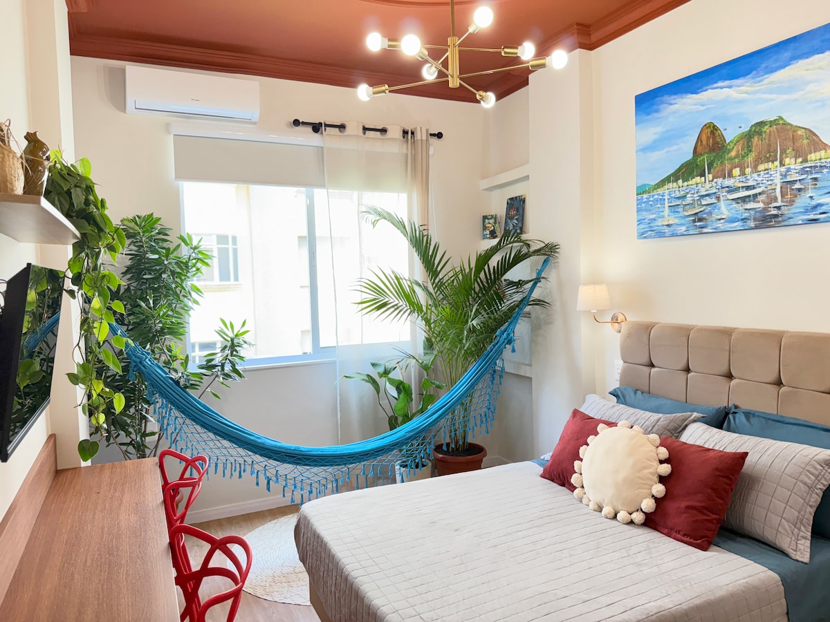 Ціла квартира, розташована на проспекті Носа-Сеньора-де-Копакабана, в півтора кварталах від пляжу, Post 5, поблизу Іпанеми та Лагоа, станції метро Cantagalo, розташована від Av. з дуже гарною площею перед будівлею (Pç Sarah Kubistchek), тихою та ідеальною для сім 'ї. Затишна квартира, продумана в кожній деталі з любов 'ю, має інфраструктуру з зручними меблями, кухнею, ліжком, столом і ванною, щоб забезпечити приємне та гостинне перебування.