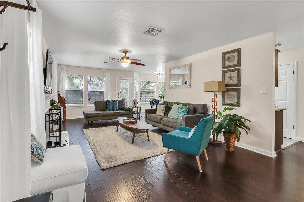 Ласкаво просимо на ваш ідеальний сімейний відпочинок! Наша шикарна затишна оселя, розташована в безпечному, тихому районі, пропонує ідеальне поєднання комфорту та зручності. Ми знаходимося в декількох хвилинах ходьби від парку та стежки Браші-Лейк і всього в декількох кроках від численних барів і ресторанів. Розташоване в центрі міста, ви всього в 15 хвилинах від торгового району Domain, в 18 хвилинах від критого аквапарку Калахарі та в 30 хвилинах від центру Остіна. Це ідеальне місце для вашої пригоди в Остіні!