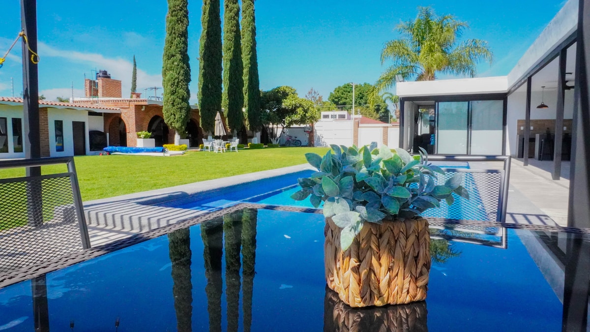 Vista Infinita A beautiful modern home with expansive southern views of Lake Chapala. The decor is contemporary Mexican. Great privacy between bedrooms, each with its own luxury bathroom. Large pantry and two car garage. Well equipped kitchen with gas cooktop. BBQ. Easy access, no stairs. 13 meter infinity pool & jacuzzi spa: heated! Gas fireplace. Screens through out with large smooth operating sliding doors. Luxury linens, spa like white fluffy towels. Artful and decorative!