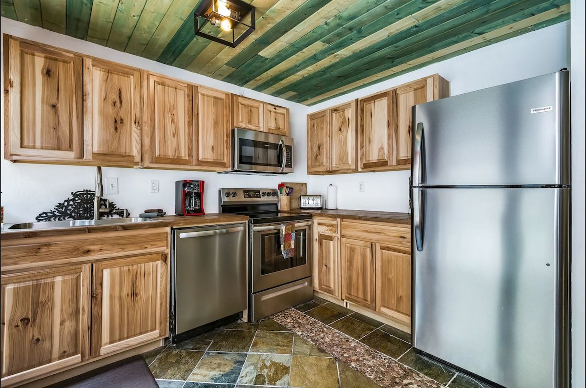 >> Дійсна ліцензія на короткострокову оренду 2018-9042 > Житлова площа площею близько 900 квадратних футів > Сводчастідерев 'яні стелі з відкритими дерев' яними балками >70-дюймовий телевізор Vizio Smart TV > Інтернет-провайдер Taos Net > Гідромасажна ванна преміум-класу на 3 осіб >Повнорозмірна кухня з газовою плитою, мікрохвильовою піччю, холодильником, посудомийною машиною та утилізацією сміття. >Відремонтована ванна кімната з душем і раковиною >Пральна та сушильна машини з засобами для прання >Кавоварка Keurig з безкоштовною кавою > Планування відкритого поверху чудово підходить для розваг >Зручне розташування