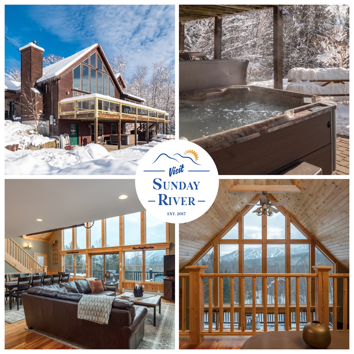 Приватна територія площею 4,5 акра розташована на приватному пагорбі в долині річки Неділя з ПАНОРАМНИМ ВИДОМ на всі стежки на гірськолижному курорті Неділя-Рівер. Це шале з 4+спальнями/3 ванними кімнатами на 14 спальних місць. Яскравий і сонячний основний рівень має відкриту планування поверху з красивим кам 'яним каміном у вітальні. У підвалі з денним світлом є друга вітальня з вогнищем і дров 'яною піччю. Насолоджуйтеся великою обгорткою навколо тераси з грилем і 7-місцевою гідромасажною ванною!