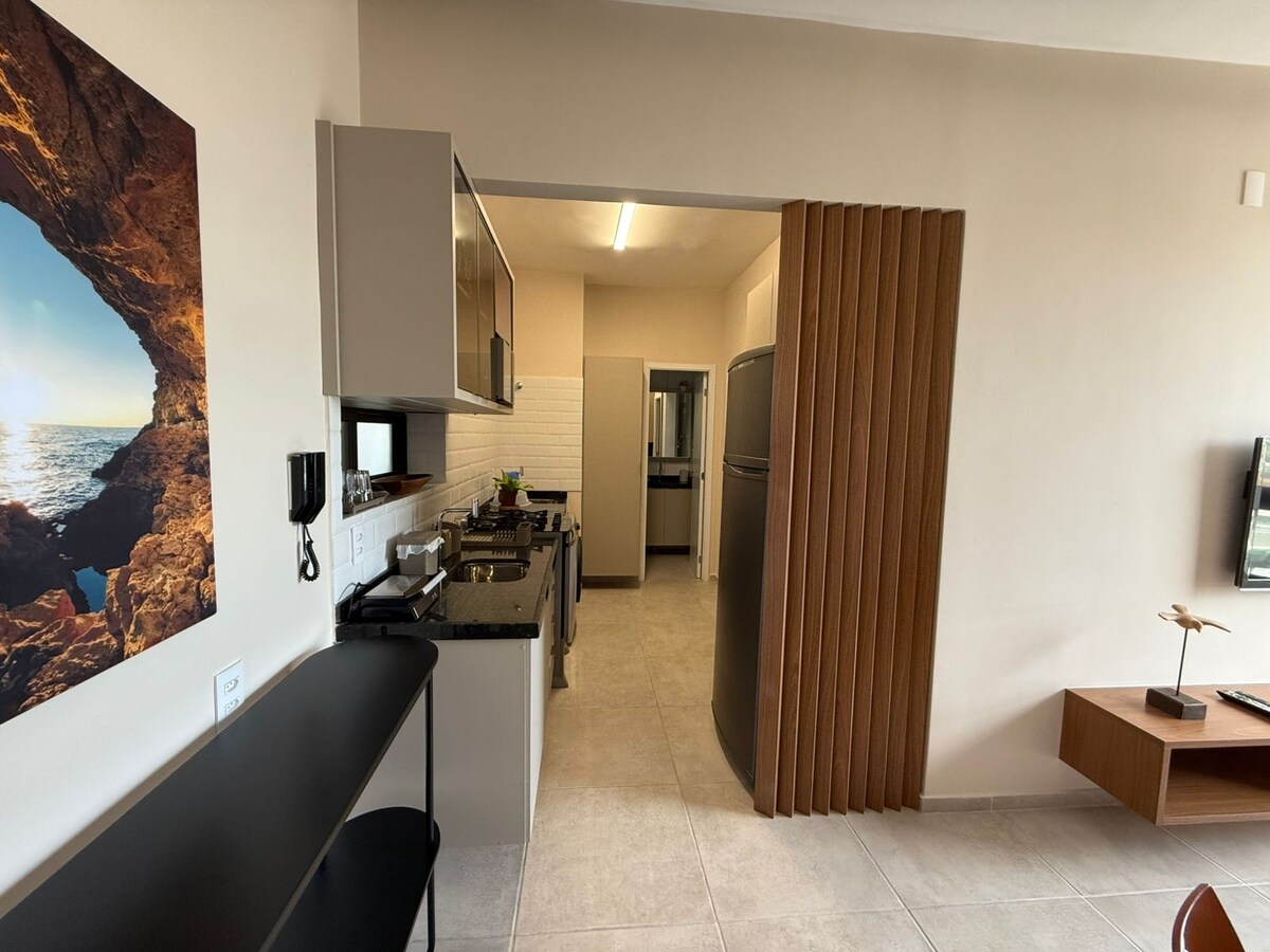 O Flat fica no décimo oitavo andar com vista para o mar. O prédio possui academia, piscina, restaurante e vaga de garagem. Excelente localização. O apartamento possui um quarto (cama queen, TV, ar-condicionado, ventilador e ferro de passar), sala (sofá-cama, TV, internet, ar-condicionado e secador de cabelo) e cozinha (pratos, talheres, copos, purificador de água, sanduicheira, liquidificador, microondas, cooktop duas bocas, frigobar, cooler térmico e máquina de café Nespresso).