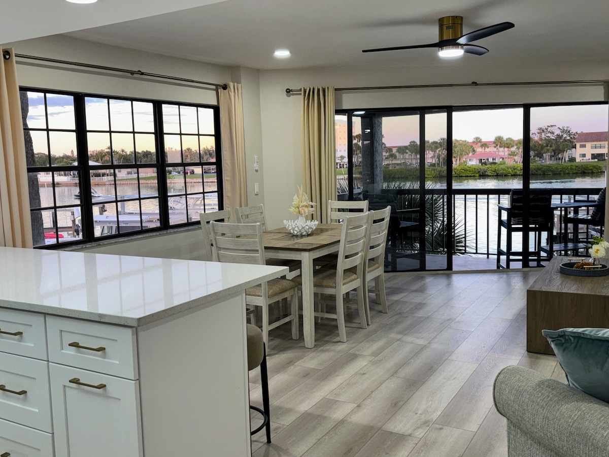 Welcome to the newly remodeled condo in the Heart of Treasure Island. This bright and modern retreat is perfect for relaxing and avoiding the crowds. Perfect location for beach lovers and wildlife watchers alike with waterfront views of the canal from the living room, kitchen and bedroom windows and beautiful sunsets. Just 2 blocks or a 5 minute walk to the beautiful white sandy beach and a few feet from the canal and heated pool. Visit nearby restaurants, John's Pass Boardwalk and live music.