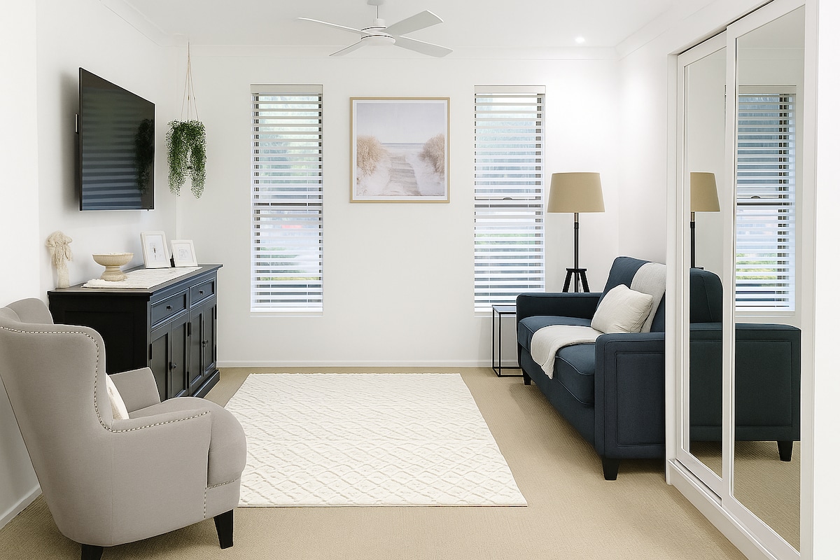 Якщо ви шукаєте затишний відпочинок з окремою вітальнею, спальнею queen-size, власною пральнею та ванною кімнатою, не шукайте далі! Цей гостьовий будинок - серце затоки Мортон, розташованої в кущах, де рано вранці можна побачити валлабі. Він знаходиться всього в 10 хвилинах ходьби від місцевих магазинів, ресторанів на березі озера, в декількох хвилинах їзди від пляжів, поромів до місцевих островів і виноробень. У помешканні є кондиціонер, стельовий вентилятор, Wi-Fi, вільне паркувальне місце для автофургона або човна, басейн і зона барбекю.