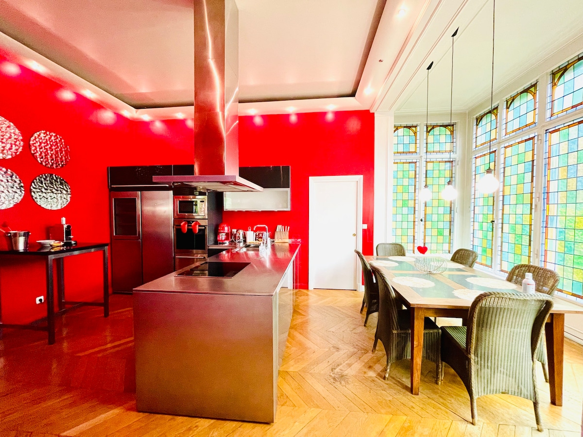 Відпочиньте на території w w . loft-spa-reims . fr, 250m2 private and parking. ВІДКРИТИЙ спа-центр, не забудований, критий басейн із підігрівом. Одна спальня з великим двоспальним ліжком, гардеробною та душовою кімнатою. Дві спальні ліжка 160x200, окрема душова кімната. Фліппер, настільний футбол, музичний автомат – усе для чудових моментів з друзями або сім’єю! Вечірки заборонені! Заборонено приймати людей, не включених до бронювання, камера знімає зовнішній вхід у лофт. Незаконна діяльність заборонена.