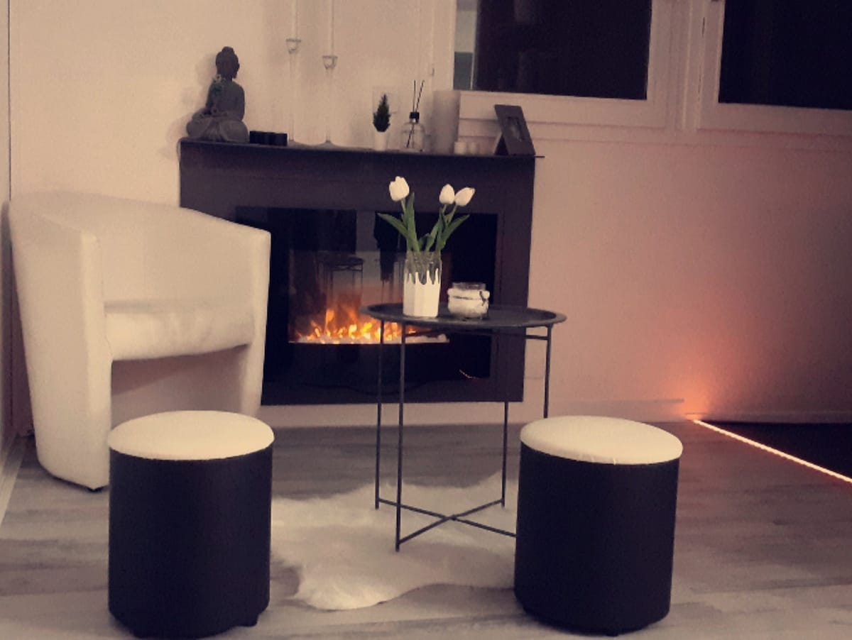 Сучасна і простора квартира в Екулі, ідеально підходить для 2–4 людей. Насолодіться великою світлою вітальнею з диваном-ліжком і телевізором, обладнаною кухнею, спальнею з двоспальним ліжком, гардеробною, красивою ванною кімнатою та приємною терасою. Надаються Wi-Fi, кондиціонер, простирадла, рушники, мило, шампунь, пральна машина та всі необхідні зручності. Тихий район, недалеко від транспорту та EM Lyon.