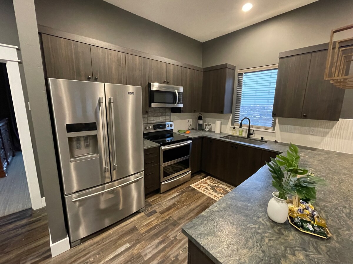 Насолоджуйтеся стильними враженнями в цьому помешканні, розташованому в центрі міста. У цьому помешканні є головна спальня з ліжком King Size, смарт-телевізор, гардеробні шафи, окрема ванна кімната, душова кабіна та велика ванна з сокером! Диван-ліжко queen-size розташований у вітальні, а також смарт-телевізор і відкрита концептуальна кухня. Над окремим гаражем Airbnb розташований ще менший Airbnb, якщо потрібно більше кімнати, щоб ви могли побачити інших на вулиці помешкання.