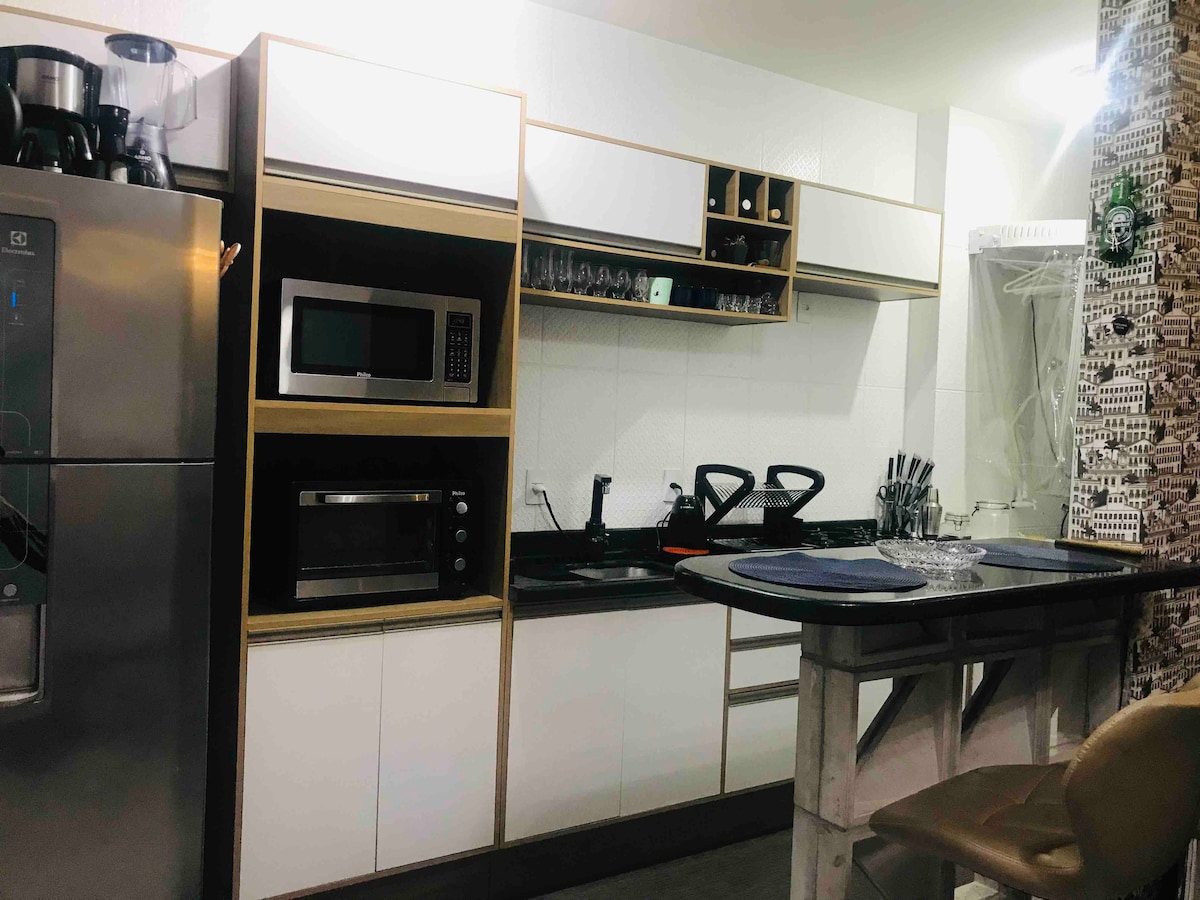 Чудова квартира в стилі кондомініуму до центру міста Крісіума. Розміщується до 6 осіб у трьох номерах із кондиціонером і роздільним матрацом, 1 додатковим двоспальним матрацом. Тут є смарт-телевізор із потоковим передаванням і + 40 000 каналів, серіалів, спортивних і кінотеатрів. Безкоштовний Wi-Fi, роздільник повітря та вентилятор. Квартира обладнана основною корисною електронікою та місцем для барбекю. Гараж приватний, і ми надаємо ліжко, столову та банну білизну, прибирання та туалетне приладдя. Чудове співвідношення «ціна-якість»!