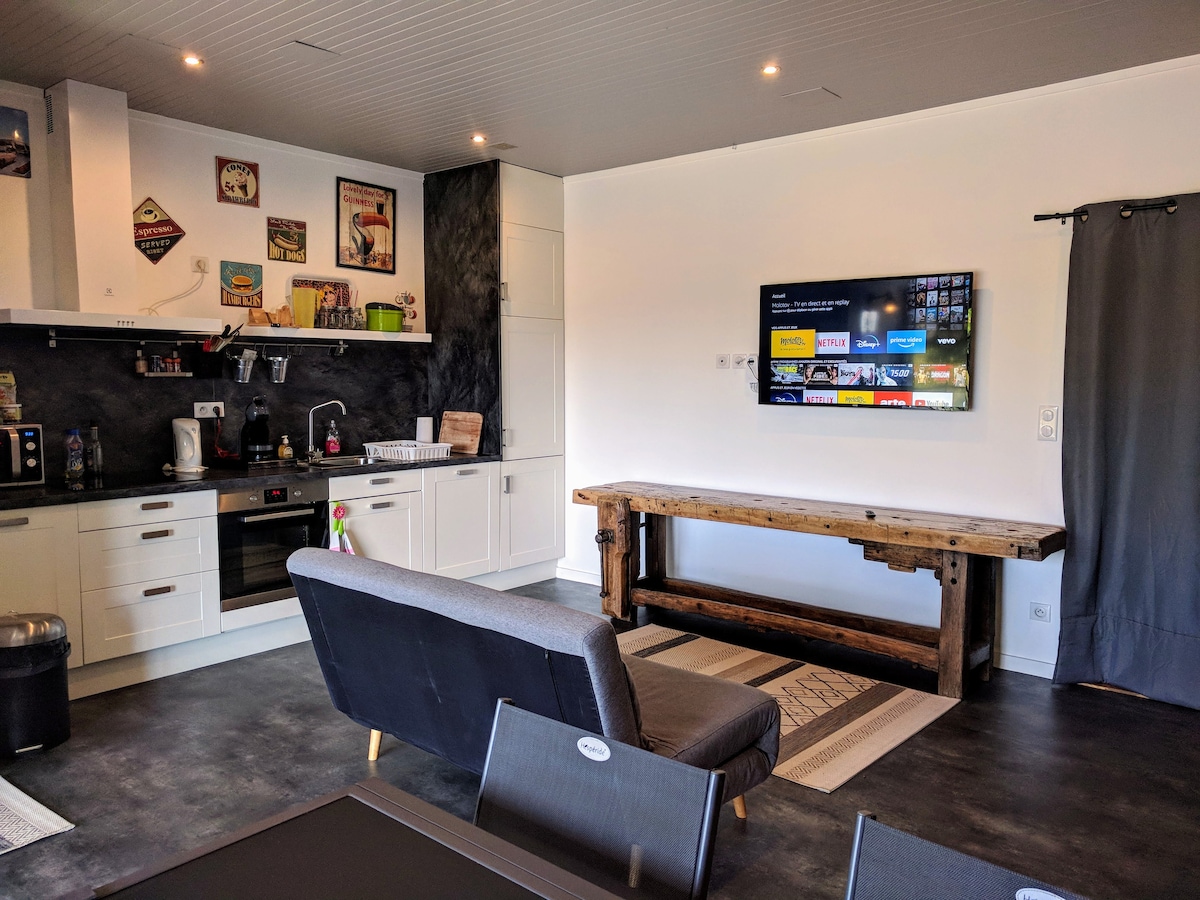 Bel appartement constitué d'un coin cuisine avec sa table mange debout équipée d'un micro ondes, une machine à laver, un four et tous les ustensiles pour cuisiner vos petits plats. Vous trouverez également un salon chaleureux avec son canapé lit 2 places, une table à manger et la télévision. Une salle de douche avec wc et lavabo. Une agréable chambre (quelques marches à monter pour y accéder, cf photo), donnant sur une petite terrasse équipée d'une table pour profiter de l'extérieur.