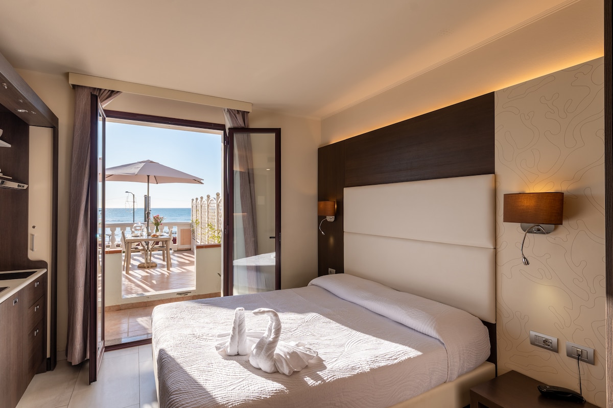Студія розташована на першому поверсі та складається з двомісної спальні з повністю обладнаною міні-кухнею, обладнаною холодильником, мікрохвильовою піччю, керамічною плитою з 2 конфорками, столом, стільцями, ванною кімнатою з душем та великою терасою з чудовим видом на море, обладнаною парасолькою, столом, стільцями та 2 шезлонгами. Усі квартири в Residence del Prado обладнані смарт-телевізором у кожній кімнаті. Постільна білизна та рушники включені.