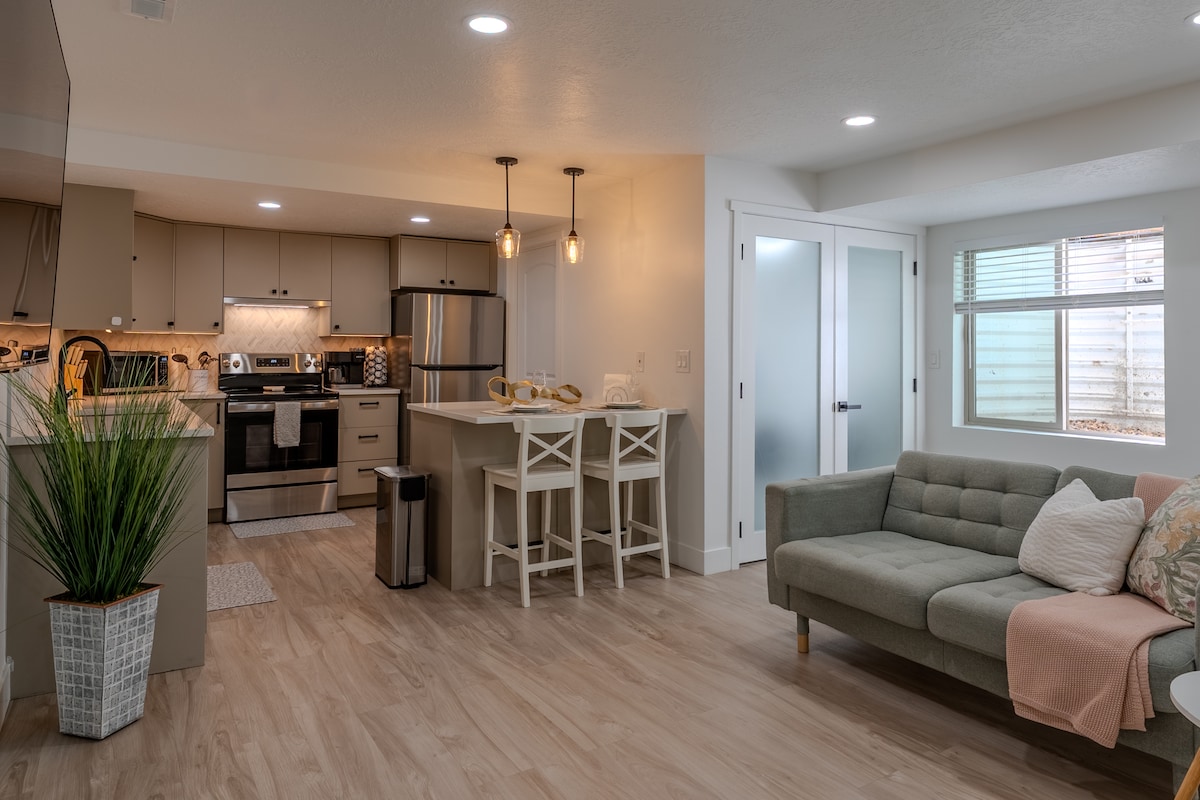 Відпочиньте в абсолютно приватній історії нашого помешкання. Вам сподобається відкрита кухня, їдальня та вітальня, де до дванадцяти осіб можуть легко повечеряти. Насолоджуйтеся окремим входом, спеціальною пральнею, великою кількістю паркувальних місць, безкоштовними розвагами для потокового передавання та супершвидким Інтернетом. Якщо вам потрібне місто або природа, ми близькі до всього цього! 30 хвилин від гірськолижних курортів і 15 хвилин від центру міста SLC. Зверніть увагу: інші гості, які приїхали на відпочинок, перебувають на першому поверсі помешкання. Спільних приміщень немає.