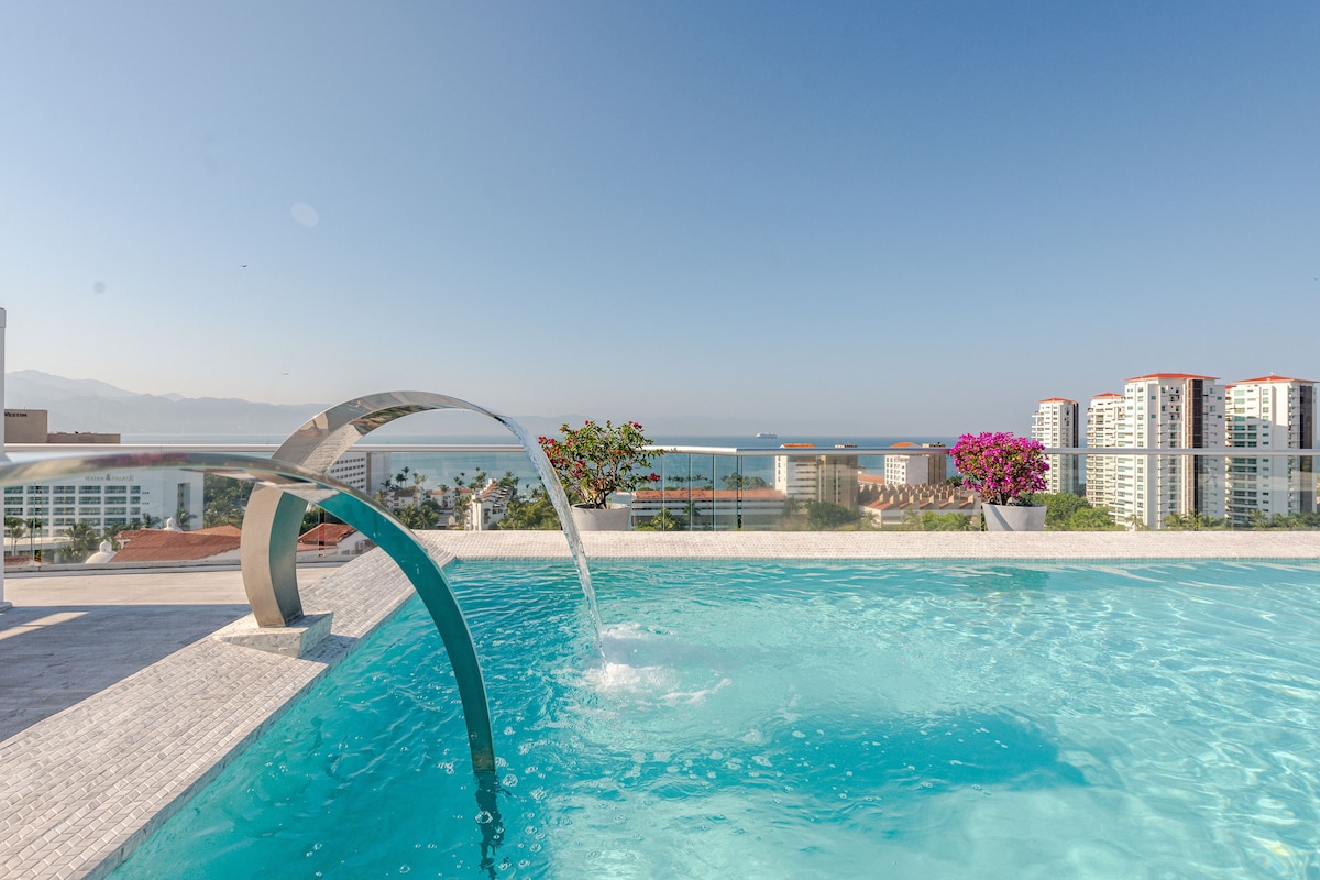 *Ремонт басейну на даху у травні–червні 2025 року Розкішна студія в найкращому місці в Пуерто-Вальяртах знаходиться всього в декількох кроках від пляжу Лос-Муертос і найкращих барів і ресторанів, розташованих в центрі романтичної зони. Цей кондомініум - один із найкращих кондомініумів у цьому районі. Моє помешкання ідеально підходить для пар, соло-мандрівників або навіть ділових мандрівників. Ви зможете насолодитися краєвидом на даху, спостерігаючи схід і захід сонця. Цей апартамент розташований на 3-му поверсі з видом на гору з окремим балконом.