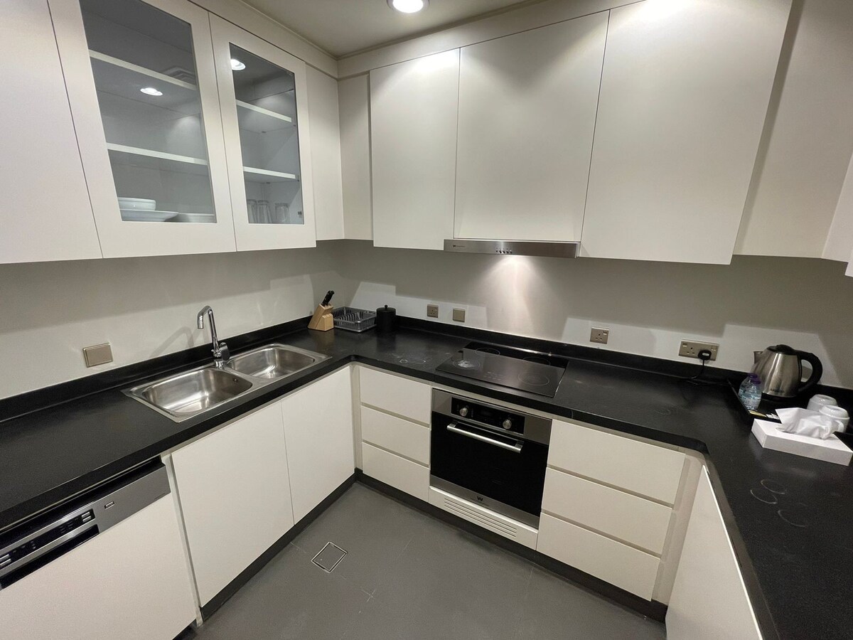 Розкішна квартира, обладнана сучасними меблями та всіма зручностями для комфорту та відпочинку. Вона складається з двох основних спалень і безкоштовного додаткового ліжка, 4 ванних кімнат і вітальні, яка вміщує до 6 осіб, а також спеціальної кімнати для прання, а також повністю обладнаної кухні. Квартира також надає вам доступ до тренажерного залу, басейну, вітальні та конференц-залу.