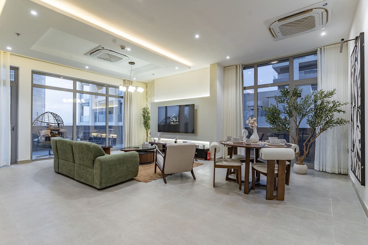 Розкішна квартира, обладнана сучасними меблями та всіма зручностями для комфорту та відпочинку. Вона складається з двох основних спалень і безкоштовного додаткового ліжка, 4 ванних кімнат і вітальні, яка вміщує до 6 осіб, а також спеціальної кімнати для прання, а також повністю обладнаної кухні. Квартира також надає вам доступ до тренажерного залу, басейну, вітальні та конференц-залу.
