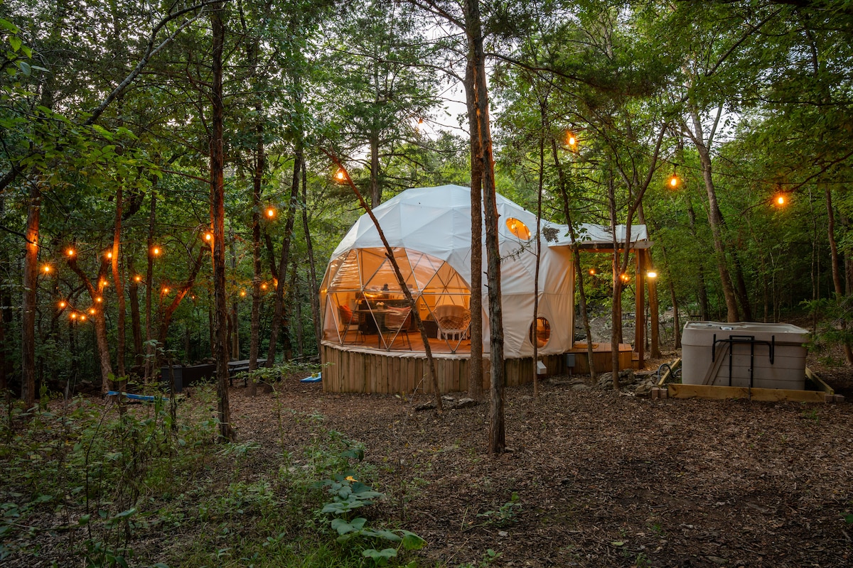 Завітайте в зимову країну чудес у Кемпфайр-Голлоу, унікальний геодезичний купол у горах Озарк. Відпочиньте в приватній гідромасажній ванні, спостерігаючи за снігопадом, прогулюйтеся тихими лісовими стежками та збирайтеся навколо тріскотливих багать під зірками. Це справді незабутня втеча від повсякденності, оточена природою та створена для затишного комфорту. Одне з найпопулярніших помешкань у Озарксі з найкращими відгуками – ідеальний варіант для чарівного зимового відпочинку.