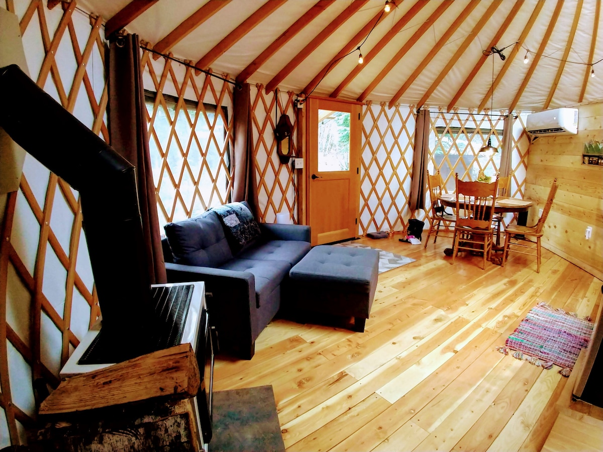 Вгорі лінії 24' Тихоокеанська юрта з усіма зручностями, щоб вивести «табір» з кемпінгу. У дивному помешканні буде все необхідне для вашого перебування. Ми надаємо французьку смажену каву, м 'ясорубку та френч-прес, а також гібридну піну пам' яті з підігрівом і латексний матрац, де можна заснути, дивлячись на 5-футовий купол біля зірок...або...сніжинки, але, швидше за все, деякий дощ...)