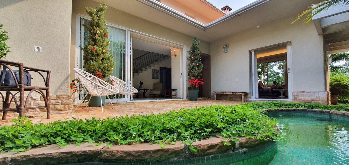 Зі зимовим садом, що розділяє простори, ви відчуєте себе в куточку відпочинку та розваг, басейн, спа, джакузі, звукове обладнання, кабельне телебачення з усіма доступними каналами, камін у 2 кімнатах, контейнери для вогняних ям на вулиці, телевізор та стерео в спальнях. Постільна білизна та рушники найвищої якості. Повна кухня. Біля торгових центрів Ельдорадо та Ігуатемі та 2 площі з великою кількістю природи.