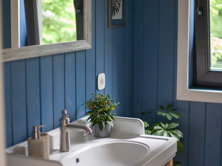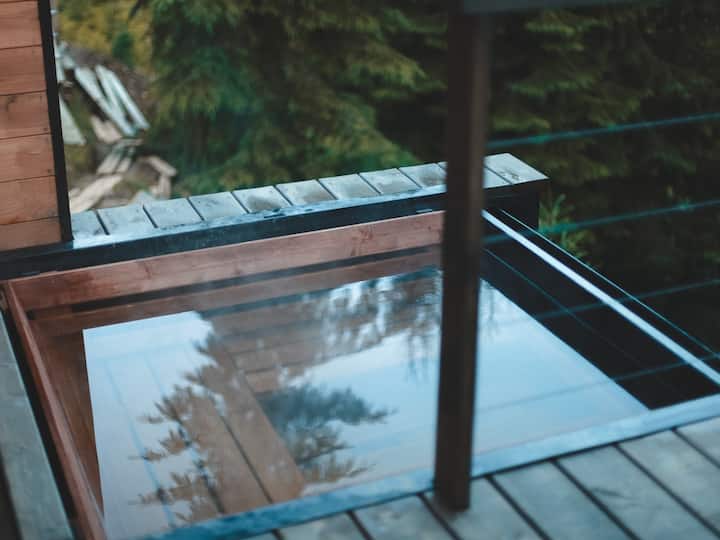 Dereva I Шале у лісі з чаном на терасі та каміном
