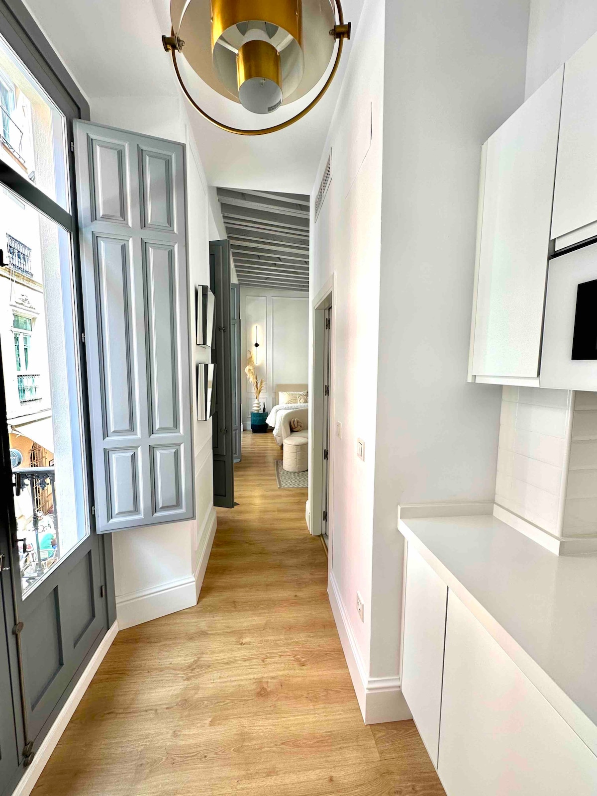 Los Ventanales, our classic 19th century two-bedroom home is centrally located in the very vibrant Old Town Malaga. Located between Calle Nueva and Calle Larios. Partly renovated, retains its original Juliet balconies with large windows and high ceilings, creating a bright and sunny space, offering a great view of the San Juan Church. The apartment is ln the middle of everything: shops, restaurants, sightseeing and a 15-minute walk to the beach.