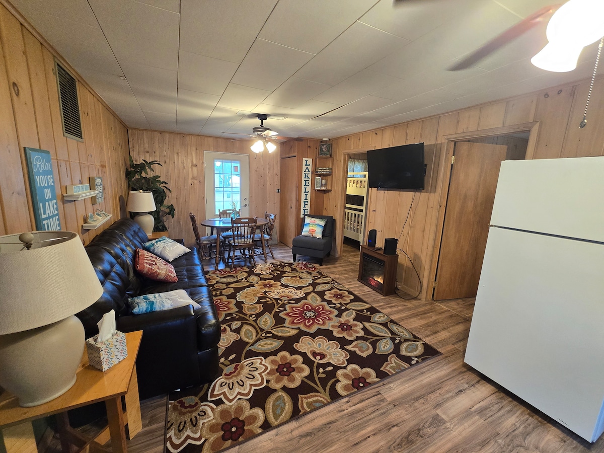 Відпочиньте й розслабтеся в затишній і стильній оселі. Камін у приміщенні, відкрита вогнищева яма (з великою кількістю деревини) та їдальня на відкритому повітрі. Кухня обладнана усім необхідним (невелика побутова техніка, каструлі та сковорідки, посуд тощо). Обідній стіл із сімейними іграми. Прямо через дорогу від озера на південному березі. Розташований неподалік від ресторанів, магазинів, магазинів морозива тощо. Половина кварталу до озера для риболовлі на льоду та снігоходах. Без домашніх тварин, будь ласка.