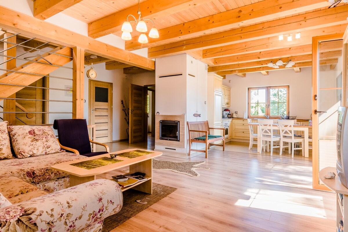 Wynajmujemy cały drewniany dom całoroczny z 2015 roku. Parter: 2 pokoje, salon z TV, kuchnią, aneksem jadalnym i wyjściem na duży, drewniany taras. Na parterze łazienka wspólna. Poddasze: sypialnia z balkonem oraz dwa pokoje, w tym jeden z balkonem oraz wspólna przestronna łazienka. W pokojach są łóżka małżeńskie, pościel i ręczniki. Kuchnia ze zmywarką, płytą kuchenną, lodówka, toster. Łazienki wyposażone w ręczniki, suszarkę, prysznic.