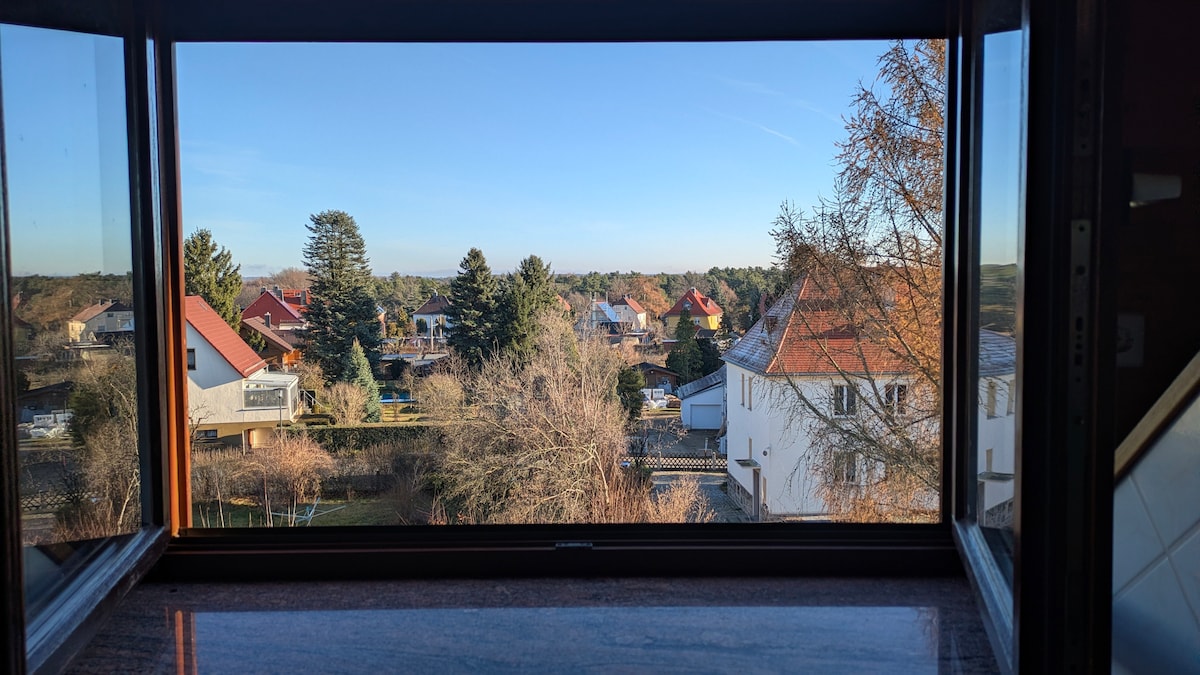 Вітаю! Я здаю в оренду мансарду площею 54 м² (3 поверх) з великим балконом і видом на Лугберг, а за гарної видимості — аж до Саксонської Швейцарії. Квартира підходить для 2-4 осіб і повністю обладнана. Вона має 1 спальню (двомісне ліжко) та вітальню з телевізором, куточком для відпочинку та диваном-ліжком (1,40х2м). Кухня обладнана плитою, мікрохвильовою піччю, куточком для сидіння та містить усе необхідне для приготування їжі або випікання. Ванна кімната обладнана туалетом, умивальником та душем.