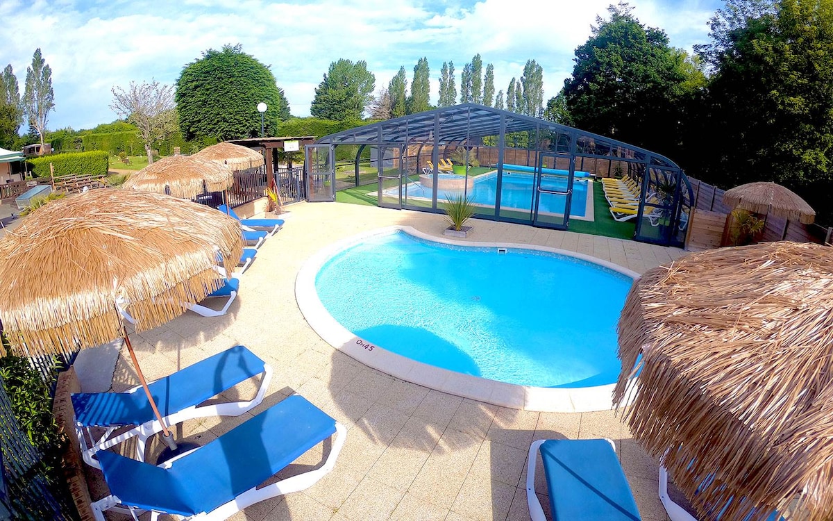 Цей заміський будинок із сучасним декором і повністю облицьованим деревом ідеально підходить для сімей. Обладнана вітальнею/вітальнею, що розділяє спальні з обох боків, чайником, кавоваркою, тостером, кожен зможе зберегти свою незалежність та приватність під час зустрічі у загальній вітальні. Цей котедж для 1 - 4 осіб площею 25 м ² + 11 м² з критою терасою включає: 1 спальню з двоспальним ліжком 140x190, шафи та шафу для однієї спальні з двома ліжками 80x190, шафи для гостя/вітальня з лавкою, столом, двома стільцями Кухонна зона з 4-годинною газовою плитою, раковиною, холодильником, мікрохвильовою піччю, посудомийною машиною, чайником, кавоваркою, тостером та кухонним посудом Ванна кімната з душем, раковиною, рушником, сушаркою для рушників та феном для волосся окремі меблі WC Garden на терасі Wifi (5 годин пропонується в проживанні, безкоштовно в лаунж-барі) Телевізор з плоским екраном VMC та посиленою ізоляцією 2 великих та 2 малих рушника, килим киливом та чайним рушником, що надаються по прибудуванню в кожному помешканні за 1 €, подарованим Reforest 'Act to Plantes