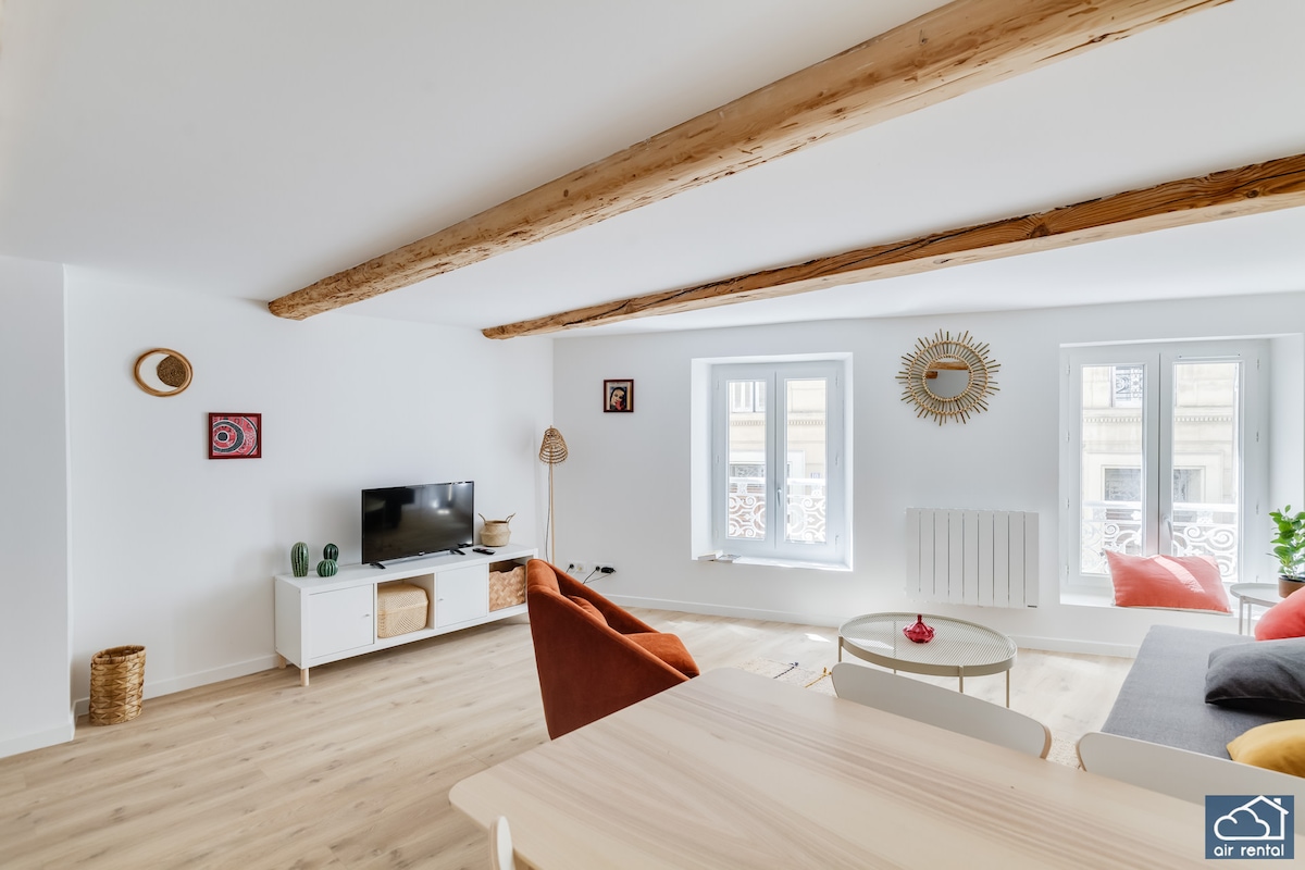 T2/3, 59 м2, розташована на 3-му поверсі з ліфтом, наодинці на посадці. Ідеально підходить для пари або двох друзів (двоспальне ліжко ділиться на 2 односпальні ліжка). Світла двомісна вітальня з дерев 'яною підлогою, невеликим балконом і сонячною лоджією. Повністю обладнана велика спальня, кондиціонер, посилене подвійне скління, окремий туалет. Центральний, дуже добре обслуговується, поруч із площею Реформ: органічним ринком, кафе, артплексом і кінотеатром Les Variétés.