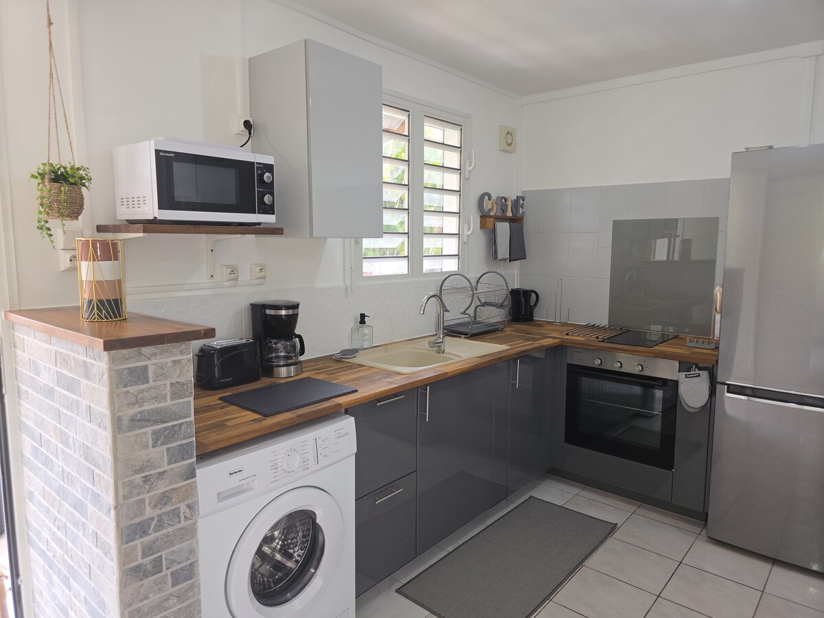 Чарівна квартира, комфортна, з вишуканим та елегантним декором, на першому поверсі нашої вілли, на лісистій території в тихому місці, на пагорбі між морем і горами. Приголомшливий краєвид на затоку Сент. Ідеально підходить для 4 осіб або пари з дітьми. 45 хвилин від аеропорту, 5 хвилин від пірсу до Ле-Сент і відправлення закулісного походу. 10 хвилин від гарячих джерел Доле, пляжу Гранд-Анс (чорний пісок). 15 хвилин від водоспаду Ле-Карбет