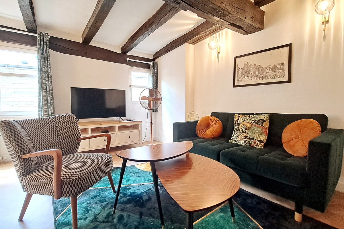 Ідеально розташована в центрі старих турів, приходьте і відкрийте для себе цю яскраву квартиру, повністю відремонтовану та сповнену шарму (камін, антикварний паркет, висота стелі). У будівлі з великою кількістю характеру, з якої відкривається вид на площу Гранд-Марше, відому як площа Монстре, яка знаходиться в самому жвавому районі Турів. Поруч із ресторанами, магазинами, університетом та чудовими місцями Турів. Ідеально підходить для вивчення історичного центру та берегів Луари.